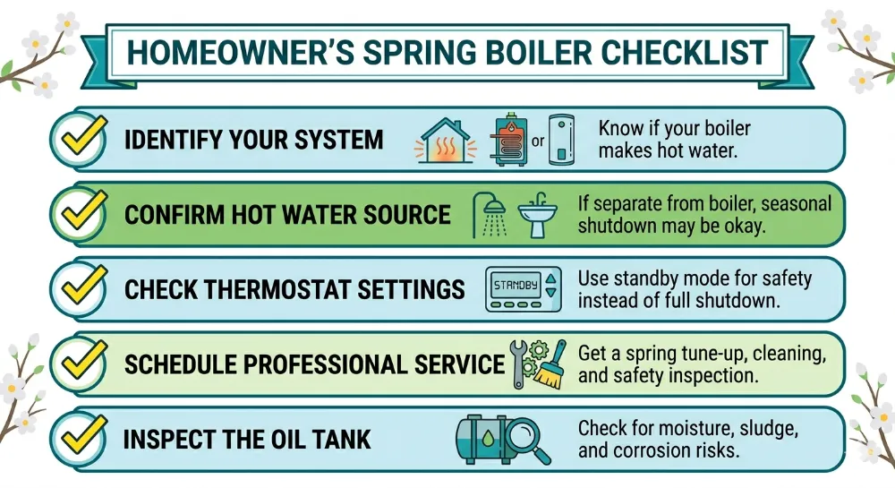 Here is the simple rule of thumb: if your boiler only heats your home, spring may be a good time to turn it off. If it also helps provide hot water, have a pro check the setup before you switch it off.